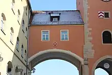 Lorsque la grange a été agrandie en 1551 par la ville impériale de Ratisbonne, le canal a été comblé entretemps[2]. Elle consiste en un édifice imposant à toit en bâtière à quatre étages de pierres de carrière, formant une croupe à l'ouest.