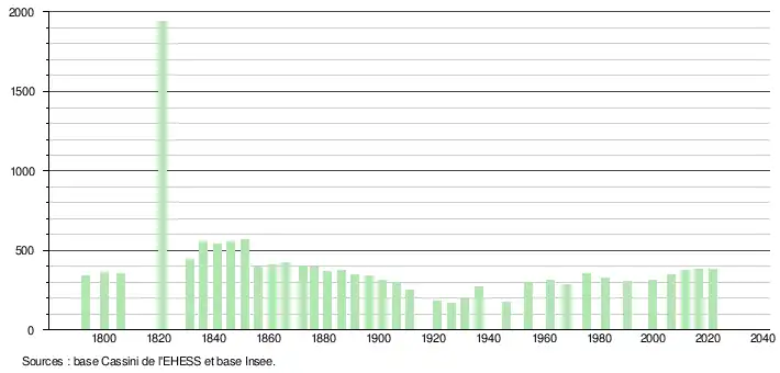 L'évolution du nombre d'habitants est connue à travers les recensements de la population effectués dans la commune depuis 1793. Pour les communes de moins de 10 000 habitants, une enquête de recensement portant sur toute la population est réalisée tous les cinq ans, les populations légales des années intermédiaires étant quant à elles estimées par interpolation ou extrapolation[22]. Pour la commune, le premier recensement exhaustif entrant dans le cadre du nouveau dispositif a été réalisé en 2006[23].