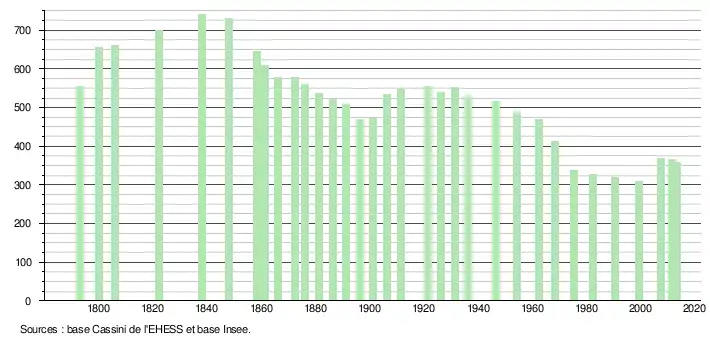 L'évolution du nombre d'habitants est connue à travers les recensements de la population effectués dans la commune depuis 1793. À partir du , les populations légales des communes sont publiées annuellement dans le cadre d'un recensement qui repose désormais sur une collecte d'information annuelle, concernant successivement tous les territoires communaux au cours d'une période de cinq ans. Pour les communes de moins de 10 000 habitants, une enquête de recensement portant sur toute la population est réalisée tous les cinq ans, les populations légales des années intermédiaires étant quant à elles estimées par interpolation ou extrapolation[3]. Pour la commune, le premier recensement exhaustif entrant dans le cadre du nouveau dispositif a été réalisé en 2007[4],[Note 1].