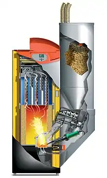 - le poêle ou la chaudière à granulés peuvent fonctionner de manière entièrement automatique grâce à une alimentation en combustible mécanisée ; avec un réglage permettant théoriquement mieux de minimiser les émissions de composés organiques volatils (COV), goudrons et dioxines[réf. nécessaire] (par rapport aux bûches) ;