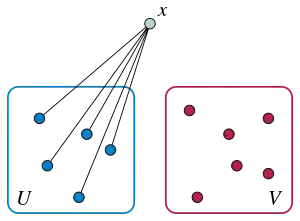 x est par construction plus grand que tous les éléments de U et de V, adjacent à tous les éléments de U, et puisque U et V sont disjoints, x n'est adjacent à aucun élément de V[alpha 1].