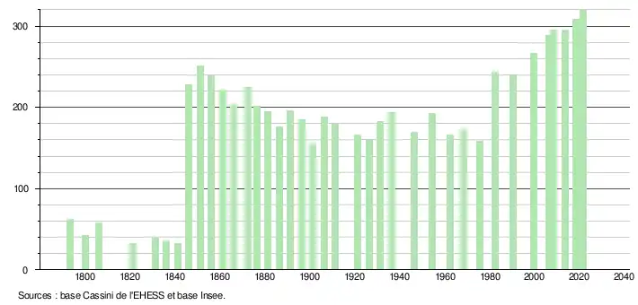L'évolution du nombre d'habitants est connue à travers les recensements de la population effectués dans la commune depuis 1793. Pour les communes de moins de 10 000 habitants, une enquête de recensement portant sur toute la population est réalisée tous les cinq ans, les populations légales des années intermédiaires étant quant à elles estimées par interpolation ou extrapolation[20]. Pour la commune, le premier recensement exhaustif entrant dans le cadre du nouveau dispositif a été réalisé en 2008[21].
