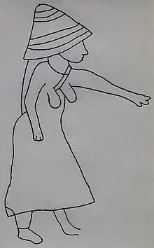Les vêtements des femmes, dont les poitrines sont souvent nues et les chevelures abondantes, peuvent être des jupes qui, serrées à la ceinture, descendent un peu au-dessus de la cheville. Plusieurs figures ne présentent qu'un trait à la ceinture (station XXIV), une bande (station XXXVII) ou un petit pagne triangulaire (station XXXI). À la station L deux bandes diagonales traversent la partie supérieure d'une figuration féminine à la façon de bretelles.