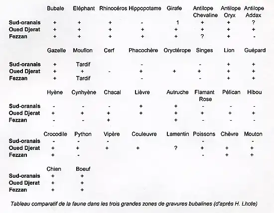 Comparant selon les mêmes critères les gravures bubalines de l'Oued Djerat et celles du Sud-oranais, l'auteur parvient aux mêmes conclusions, l'absence de l'hippopotame et de la girafe parmi les figurations de l'Atlas saharien pouvant s'expliquer par des causes hydrographiques et géographiques. L'abondance du bélier dans le bestiaire sud-oranais devrait selon lui être mis « en relation avec le rôle religieux » qu'il a joué essentiellement dans la région. D'autres différences seraient l'absence de figures zoomorphes et de scènes de coït. Dans la phase décadente ce sont des personnages accroupis masculins que l'on rencontre dans le Sud-Oranais, dans l'Oued Djerat ou au Fezzan il s'agit de femmes, alors que dans le Constantinois les deux sexes sont figurés dans cette posture[26].