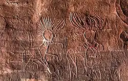 Le plus grand, d'une hauteur de 1,50 m, (Ovis longipes) porte un disque agrémenté latéralement de deux feuilles (ou de plumes schématisées) et un collier. Il « représente, par la qualité de son style et surtout par celle de sa technique, qui met en valeur le détail des attributs, de l'œil, des cornes, des oreilles et des jarres, la plus belle œuvre de l'art pariétal africain »[9]. Le bélier est associé à un homme portant un carquois et un bouclier qui lui tourne le dos. Son visage est allongé en museau et sa tête semble recouverte d'une coiffe ou d'un masque qui retombe à mi-bras. Le trait peu profond est par contre poli superficiellement.