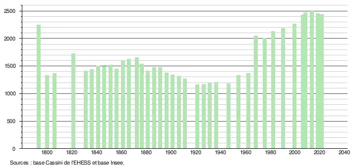 | L'évolution du nombre d'habitants est connue à travers les recensements de la population effectués dans la commune depuis 1793. Pour les communes de moins de 10 000 habitants, une enquête de recensement portant sur toute la population est réalisée tous les cinq ans, les populations légales des années intermédiaires étant quant à elles estimées par interpolation ou extrapolation[27]. Pour la commune, le premier recensement exhaustif entrant dans le cadre du nouveau dispositif a été réalisé en 2008[28]. En 2021, la commune comptait 2 430 habitants[Note 6], en diminution de 4,67 % par rapport à 2015 (Landes : +4,9 %, France hors Mayotte : +1,84 %). |