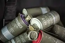 La M18 est une grenade fumigène générant un nuage coloré et généralement utilisée à des fins de marquage. Elle est disponible en rouge, vert, jaune ou violet[7].