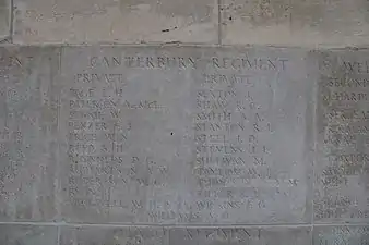 Implanté au fond du cimetière, le mémorial néo-zélandais est un mur de pierre blanche sur lequel sont gravés les noms de 446 soldats néo-zélandais tombés en 1918 et dont les tombes sont inconnues.