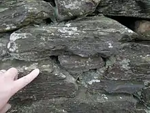 Durant les travaux de fouilles des années 1870, Bernard décrit avec détail la découverte de nombreux artéfacts. Une pierre large de 40 cm fut découverte dans la niche d'une embrasure de porte. Elle possédait un trou central circulaire de 8 cm de profondeur et de 4 cm de diamètre. Une pièce de bois pourri occupait ce trou. Bernard fut incapable d'en comprendre l'usage, suggérant seulement qu'il s'agissait peut-être d'un cadran solaire.