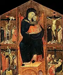 - et la Grande Maestà de Berlin (c.1300-1305), une Vierge à l’Enfant avec quatre Histoires de la passion du Christ, attribué par Boskovits au peintre.