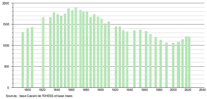 L'évolution du nombre d'habitants est connue à travers les recensements de la population effectués dans la commune depuis 1793. Pour les communes de moins de 10 000 habitants, une enquête de recensement portant sur toute la population est réalisée tous les cinq ans, les populations légales des années intermédiaires étant quant à elles estimées par interpolation ou extrapolation[31]. Pour la commune, le premier recensement exhaustif entrant dans le cadre du nouveau dispositif a été réalisé en 2007[32].