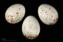 En Europe, la femelle pond en mai-juin cinq à huit œufs, généralement cinq ou six, mais au Japon la ponte a plutôt lieu de mai à juillet, ne comprenant que trois à cinq œufs. Ces œufs sont ovales, blancs tachetés de rouge-brun ou de gris, de manière plus dense en allant vers le bout le plus arrondi[3],[4]. Leur taille a pour valeurs extrêmes : 14,0-16,7 mm × 11,0-13,0 mm[2], pour un poids de 1,2 g, dont 6 % de coquille[13].