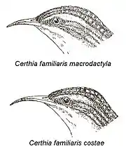 - C. f. macrodactyla Brehm, 1831, de protonyme Certhia macrodactyla, vit en Europe de l'Ouest. Le dessus est plus pâle et le dessous plus blanc que chez britannica[4] ;