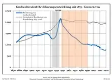 Développement de la population dans les limites actuelles. -- Ligne bleue: Population; Ligne pointillé: Comparaison avec le développement de Brandebourg -- Fond gris: Période du régime nazie; Fond rouge: Période du régime communiste