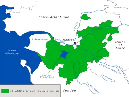 L'aire d'appellation se superpose sensiblement à celle du muscadet[3]. Son terroir s'étend sur l’ensemble du vignoble nantais, d’Ancenis à Pornic, avec deux pôles de production plus importants : l'est de la région Sèvre-et-Maine d’une part (Le Loroux-Bottereau et Vallet) et les régions de Logne, Boulogne et d'Herbauges d'autre part avec Corcoué-sur-Logne et Saint-Philbert-de-Grand-Lieu. La zone de prédilection du gros-plant se situe dans le Pays de Retz[12]. Cette zone d'appellation comporte 92 communes, soit 69 communes de la Loire-Atlantique, 16 communes en Maine-et-Loire et 4 communes en Vendée[2].