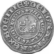 - l'avers représente la couronne de Bohême avec deux inscriptions circulaires, l'une portant le nom latin et le chiffre du souverain et l'autre DEI GRATIA REX BOEMIE (Par la grâce de Dieu roi de Bohême).