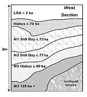 Les fouilles conduites sous la direction de C.S. Henshilwood depuis 1991 à Blombos ont permis d’éclairer d’un jour nouveau les modes de vie du Middle Stone Age[2]. Trois phases d’occupation ont été distinguées dans la séquence stratigraphique et nommées M1, M2 et M3. Des datations obtenues par OSL (Optically Stimulated Luminescence) et par thermoluminescence ont permis d’évaluer l’âge de la phase M1 à environ 73 000 ans (OIS 5a/4), celui de la phase M2 à environ 80 000 ans (OIS 5a) et celui de la phase M3 entre 100 et 140 000 ans (OIS 5d - 5e/6)[3],[4],[5],[6]. Le sommet de la séquence a livré des vestiges datant d'environ 2 000 ans BP et correspondant à des indices d'occupation du site par des groupes agro-pastoralistes du Later Stone Age (LSA)[7].