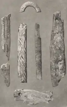 - Le no 2 est une lame d'os incomplète trouvée dans un foyer très stalagmité sous le surplomb de la grotte ; soigneusement polie sur les deux faces, elle porte à l'une de ses extrémités une perforation dont on ne voit plus que la trace. La face convexe est ornée de deux figures très schématiques, sorte de scalariforme. Il était peut-être porté en pendeloque[22].