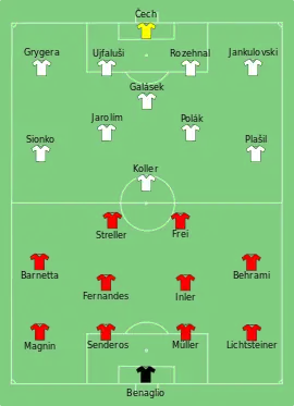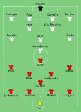 - 7 juin : la Suisse fait preuve de malchance, notamment avec la blessure au genou du meneur de jeu et meilleur buteur Alexander Frei pendant le match. Elle se crée pourtant plus d'occasions que son adversaire[1]. Malgré cela, la sélection tchèque marque un but décisif (71e) par son numéro 10, Václav Svěrkoš, qui venait de remplacer Jan Koller. La sélection helvète a eu d'autres possibilités dans ce match très serré, pour preuve le tir détourné par le poteau. Petr Čech réussit donc à garder ses cages inviolées. Suisse 0, Tchéquie 1.