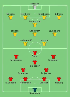 En raison des critères spécifiques de départage fixés par l'UEFA, ce match nul sur un score de 2-2 qualifie les deux équipes quel que soit le résultat de la rencontre Italie-Bulgarie ou l'ampleur d'une victoire italienne. Après le match, plusieurs Italiens, dont le gardien Gianluigi Buffon et le président de la fédération Franco Carraro, font part de leurs réserves en affirmant que les deux formations scandinaves se sont entendues pour obtenir ce résultat et se qualifier ensemble. Cependant l'UEFA, dont les limites et faiblesses du système de départage en cas d'égalité de points sont ici mises en évidence, estime qu'il n'y a pas lieu de croire que le match était truqué[1].