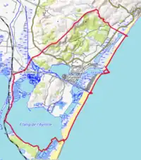 La répartition détaillée en 2018 est la suivante : eaux maritimes (30,2 %), zones humides côtières (20,5 %), milieux à végétation arbustive et/ou herbacée (13,5 %), cultures permanentes (10,5 %), forêts (9,5 %), espaces ouverts, sans ou avec peu de végétation (4,9 %), zones agricoles hétérogènes (4 %), zones urbanisées (3,4 %), espaces verts artificialisés, non agricoles (1,7 %), zones industrielles ou commerciales et réseaux de communication (1 %), prairies (0,8 %)[23]. L'évolution de l’occupation des sols de la commune et de ses infrastructures peut être observée sur les différentes représentations cartographiques du territoire : la carte de Cassini (XVIIIe siècle), la carte d'état-major (1820-1866) et les cartes ou photos aériennes de l'IGN pour la période actuelle (1950 à aujourd'hui)[Carte 2].