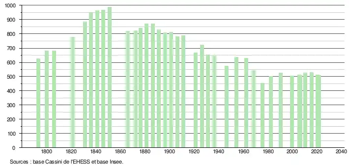 L'évolution du nombre d'habitants est connue à travers les recensements de la population effectués dans la commune depuis 1793. Pour les communes de moins de 10 000 habitants, une enquête de recensement portant sur toute la population est réalisée tous les cinq ans, les populations légales des années intermédiaires étant quant à elles estimées par interpolation ou extrapolation[23]. Pour la commune, le premier recensement exhaustif entrant dans le cadre du nouveau dispositif a été réalisé en 2005[24].