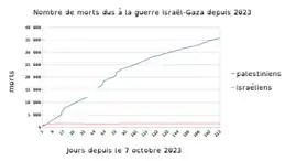 Les bombardements puis les actions des soldats de l'armée israélienne de terre déployés au sol dans Gaza, ont tué plus de 30 000 personnes[39] dont 12 300 enfants et 8 400 femmes. A cela s'ajoute un nombre élevé de blessés : 70 000 personnes[39], en majorité des civils, et au moins 7 000 personnes sont portées disparues.