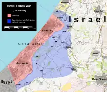 La guerre Israël-Hamas de 2023-2024[35],[36], aussi appelée guerre Israël-Gaza de 2023-2024, est un conflit opposant originellement Israël au Hamas, organisation politico-militaire palestinienne, et d'autres groupes armés palestiniens. Elle commence avec l'attaque du Hamas contre Israël du , et se poursuit avec des bombardements aériens de la bande de Gaza entrepris par Israël, puis avec l'invasion de ce territoire palestinien. C'est le cinquième conflit entre Israël et Gaza ; elle s'inscrit plus largement dans le cadre du conflit israélo-palestinien.