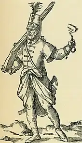 - Agrandissement et professionnalisation des armées. L'Empire ottoman commence dès les années 1530 à agrandir son armée et à augmenter la proportion de troupes salariées. Du début jusqu'à la fin de la guerre, le nombre de kapikoulous passe d'environ 16 000 à 27 000 hommes et le nombre de janissaires augmente aussi significativement tout au long du conflit[73]. Les Habsbourg quant à eux alignaient environ 100 000 hommes dès les années 1530[74] et eurent de plus en plus recours à des combattants de métier. Les haïdouks, recrutés comme mercenaires parmi les populations de réfugiés hongrois, formaient une part non négligeable de l'armée habsbourgeoise. S'ajoutaient à eux nombre de mercenaires allemands, dont beaucoup de lansquenets, recrutés dans tout le Saint-Empire[75].