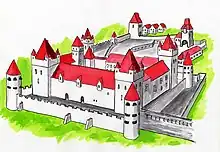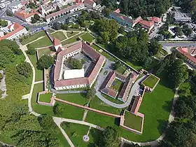 Les efforts accélérèrent en 1541 après que la ville de Buda fut prise par Soliman. Désormais privé du contrôle du Danube, Ferdinand s'empressa de construire une nouvelle ligne s'appuyant cette fois sur le massif transdanubien, seule frontière naturelle restante face aux Ottomans[81]. Les églises et manoirs locaux servirent souvent de fortifications improvisées, renforcées par des palissades en bois et des ouvrages en terre[82]. Les forteresses existantes furent modernisées et de nouvelles furent construites, sous la supervision d'architectes italiens venu implémenter les nouvelles doctrines de fortifications en Hongrie[83]. Le tracé à l'italienne, qui avait fait ses preuves en Italie, devint la norme sur la frontière et remplaça peu à peu le réseau castral médiéval hongrois.
