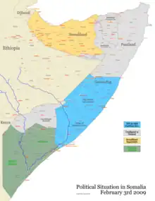 En , un accord de gouvernement, patronné par l'Éthiopie et le Kenya, échoue à ouvrir la voie à la reconstruction de l'État[3]. Le nord-est se déclare autonome en 1998 sous le nom de Puntland.