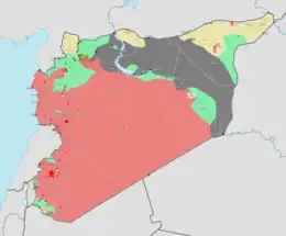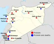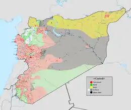 Les Kurdes de Syrie ont également protesté contre les discriminations ethniques et la négation de leur identité culturelle et de leur langue[77],[78]. Ils constituent 8,5 à 11 % des syriens. Ils ne constituent pas une confession en soi, mais sont majoritairement sunnites. Ils sont regroupés au nord-est du pays sur la frontière turque, ainsi que dans la province d'Alep, le Jazirah et la banlieue de Damas. Cette population au fort sentiment communautaire met à profit l’affaiblissement de l'armée syrienne en pour investir plusieurs villes du Nord du pays[79]. Elle est soutenue par l'espoir, entretenu par le PKK, de la création d'un Kurdistan indépendant.