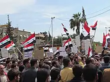 La part des chrétiens dans la population totale a fortement baissé au cours des dernières décennies, cette population émigrant beaucoup et ayant un taux de natalité faible. Le , les patriarches d'Antioche, chefs spirituels des chrétiens, lancent un appel à la paix et à un arrêt des sanctions internationales contre la Syrie[80]. Les chrétiens sont très inquiets des manifestations du vendredi et ont en mémoire leurs coreligionnaires irakiens qu'ils ont accueillis après les massacres, les quartiers mixtes seraient désertés de 80 % de leurs habitants chrétiens, notamment en décembre pour célébrer Noël[81].