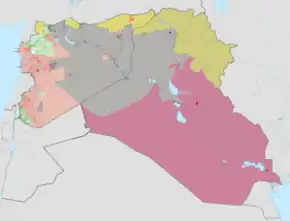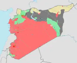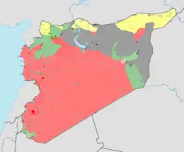 Le rapport des forces en présence est bouleversé par l'apparition en Syrie de l'organisation salafiste djihadiste État islamique en Irak et au Levant (EIIL) — rebaptisé ensuite État islamique (EI) — qui en 2014 entre en conflit contre tous les autres belligérants, s'empare de l'est de la Syrie, ainsi que du nord-ouest de l'Irak, et proclame la restauration du califat. En septembre 2014, menée par les États-Unis, une coalition internationale formée contre l'État islamique commence à mener des bombardements en Syrie et décide d'appuyer les YPG. Forts du soutien américain, les Kurdes remportent une première victoire à Kobané en janvier 2015, forment en octobre 2015 une alliance avec des groupes arabes qui prend le nom de Forces démocratiques syriennes (FDS), et lancent une campagne contre les djihadistes qui aboutit en octobre 2017 à la chute de Raqqa, la « capitale » syrienne de l'EI. La Turquie intervient également militairement en Syrie : d'abord contre l'État islamique en 2016 et 2017, avant d'attaquer les FDS en 2018 en raison de leurs liens avec le PKK.