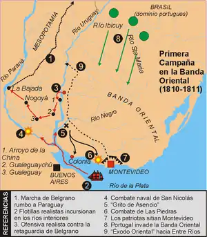 À l’issue d’une démarche infructueuse entreprise à Montevideo par Juan José Paso, secrétaire de la Junte[12], celle-ci ouvrit les hostilités contre les royalistes de Montevideo, dont le cabildo rompit de son côté ses relations avec Buenos Aires le [37].