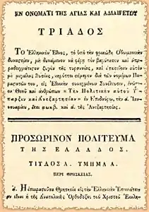 Le (calendrier julien soit le du calendrier grégorien), à Épidaure, l’assemblée nationale d'Épidaure proclama l’indépendance de la Grèce, vota une constitution et adopta le drapeau bleu et blanc comme drapeau national. Elle désigna les membres des institutions créées par la constitution : le Conseil exécutif présidé par Aléxandros Mavrokordátos, le Bouleutikó (législatif) avec pour président Dimítrios Ypsilántis et le vice-président Petrobey[61]. Le parti des « politiques » avait réussi à imposer sa conception du pouvoir au parti des « militaires ». Cependant, ces derniers ne voulaient pas reconnaître leur défaite tandis que les « politiques » désiraient se débarrasser définitivement du parti des « militaires ». Une alliance entre les notables du Péloponnèse et des îles se tourna contre les « militaires » et une première guerre civile commença, permettant la contre-offensive ottomane[62].