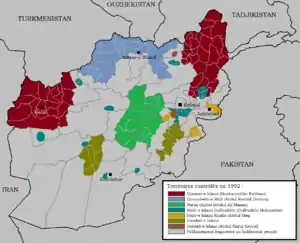 Le , Burhanuddin Rabbani, le chef du parti Djamiat est nommé Président. Seulement son autorité est limitée à une partie de la capitale ; le reste de la ville reste divisé entre des factions miliciennes rivales. Le , un éphémère cessez-le-feu est rompu lorsque les forces du Hezb-e-Islami Gulbuddin renouvellent des attaques de roquettes sur Kaboul à partir de leur base située au sud de la ville ; ces attaques sont supervisées par le commandant Toran Khalil[33]. Des centaines de personnes sont tuées et blessées tandis que de nombreuses maisons sont détruites pendant ce choc entre Hezb-e Islami et Djamiat.