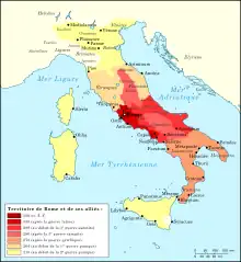 Rhêgion, dont la garnison capouane s'est révoltée sous le commandement du général campanien Decius Vibullius, est reprise en 271 ou 270 par le consul Caius Genucius Clepsina. Les mutins sont sévèrement châtiés pour leur trahison[14] alors qu'ils ont été utilisés par Rome depuis leur révolte, recevant même des renforts[84],[82]. Finalement, c'est toute l'Italie méridionale qui tombe sous le contrôle des Romains. Rome achève ainsi sa conquête de la Grande-Grèce italienne[51] avec un coût en hommes assez élevé : selon Tite-Live, Rome perd 16 000 citoyens entre 281 et 275[72]. Une colonie est fondée sur le site de Maleventum en 268[a 32], rebaptisée Beneventum en souvenir de la victoire romaine, à l'origine du nom actuel de Bénévent.