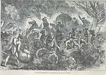Braddock quitte le Maryland le [75]. Alors qu’il a minutieusement préparé son armée, il commet l’erreur tactique de se lancer à travers les bois avec une colonne de 2 200 hommes alourdie par de l’artillerie et des bagages, exactement comme s’il s'agissait de faire campagne dans les Flandres ou en Allemagne[33]. Il est faiblement soutenu par les colons américains qui n’ont pas été consulté sur les choix opérationnels[77]. Seul Benjamin Franklin, alors directeur des postes de Pennsylvanie, remplit son engagement de fournir cent-cinquante chariots[30]. La lourde colonne avance lentement dans les forêts en traçant une route pour faire passer l’artillerie, ce qui laisse le temps aux éclaireurs de la repérer. En face, Charles de Langlade, Liénard de Beaujeu et Jean-Daniel Dumas rassemblent une troupe franco-amérindienne de 850 hommes[78] détachée depuis Fort Duquesne et qui combattent selon la tactique de la « petite guerre ». Le , ils surprennent les Anglo-Américains sur les rives de la Monongahela et les mettent en déroute après une furieuse bataille. Braddock est tué, 1 500 de ses hommes sont mis hors de combat (blessés ou tués), tandis que tout son bagage (y compris ses archives[79]), toute son artillerie et 400 chevaux tombent entre les mains des Franco-Amérindiens, dont les pertes sont faibles[80]. Les Amérindiens ont joué un rôle essentiel dans cette bataille[81].