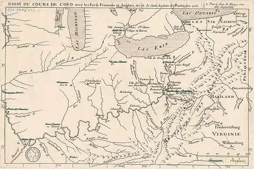 En application du programme défini par La Galissonière, les Français décident de leur barrer la route et de s’implanter militairement dans l’Ohio[33]. En 1749, le gouverneur français envoie 230 hommes, consistant en un amalgame de miliciens canadiens, de troupes de marines et d’Amérindiens Abénaquis. Leur mission est de décrire, d’effectuer des reconnaissances, de dresser des cartes et de planter les armes de la France[33]. Céloron de Bienville, major de Détroit qui commande l’expédition, y enterre des plaques de plomb pour acter la prise de contrôle française[30]. Il constate surtout que les Britanniques sont déjà bien implantés dans la région et que l’influence de la France sur les Amérindiens est déclinante[34]. En 1752, est lancée la première offensive française : Langlade, un métis franco-amérindien à la tête d’une troupe de Chippewas et d’Ottawas, balaye, lors d’un raid de terreur toutes les implantations britanniques dans la région[30]. Il détruit Pickawillany, leur base la plus avancée chez les Miamis, tue un de leurs chefs pro-britanniques et reprend le contrôle des tribus[33].