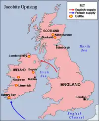 Jacques II avait fui en France où l'attendait Louis XIV. En , soutenu par l'argent, les troupes et les généraux français, il quitte son exil à Saint-Germain pour rallier ses partisans catholiques en Irlande. Le roi de France soutenait Jacques II pour deux raisons : premièrement, Louis XIV croyait fermement dans son droit divin au trône, et deuxièmement il souhaitait éloigner les forces de Guillaume à l'écart des Pays-Bas[48]. L'objectif initial de Jacques II, et de son bras droit le duc de Tyrconnell, était de détruire les places-fortes protestantes du Nord. Cependant, son armée de 40 000 hommes mal équipés ne put pas faire plus qu'assiéger Londonderry. Après une défense acharnée de la ville durant 105 jours, il doit lever son siège à la fin du mois de juillet. Dans le même temps, le premier engagement naval majeur de la guerre a lieu lors de la bataille de la baie de Bantry le , avant la déclaration de guerre anglaise, qui se termine en une petite victoire française : Châteaurenault parvient à livrer du ravitaillement pour la campagne de Jacques II. De leur côté, les forces loyales à Guillaume reçoivent du soutien par le nord et en août, le duc de Schomberg arrive avec 15 000 renforts danois, néerlandais, huguenots et anglais. Après avoir pris Carrickfergus, son avancée est toutefois ralentie devant Dundalk par l'hiver, les maladies et les désertions[49].