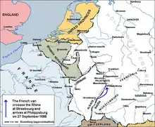 Le maréchal Duras et Vauban, avec 30 000 hommes sous le commandement nominal du Dauphin, assiègent la forteresse de Philippsburg, située dans l'électorat de Trèves, du au . Elle tombe après une âpre lutte[38]. L'armée française continue vers Mannheim qui tombe le , puis vers Frankenthal. D'autres villes tombent sans résistance comme Oppenheim, Worms, Bingen, Kaiserslautern, Heidelberg, Spire et surtout la stratégique forteresse de Mayence. Après que Coblence eut refusé de se rendre, Boufflers la soumet à un intense bombardement qui provoque de gros dégâts mais ne fait pas tomber la ville[38].