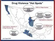La guerre de la drogue au Mexique[15],[16],[17], aussi appelée la guerre des cartels au Mexique, est un conflit armé où les cartels de la drogue s'opposent au gouvernement mexicain. Elle commence à impliquer massivement l'armée mexicaine à partir de décembre 2006, bien que celle-ci ait été utilisée dans la lutte contre le trafic des stupéfiants antérieurement.