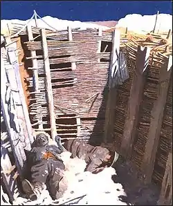 Dans les Alpes, la guerre de tranchée se livra sur les flancs à pic des montagnes jusqu'à parfois 3 900 mètres d'altitude. L'Ortles possédait une position d'artillerie sur son sommet à proximité de la ligne de front. Les réseaux de tranchées devaient s'adapter au terrain difficile et au climat extrême. Des tranchées furent même construites dans les glaciers de Marmolada et d'Adamello-Presanella.