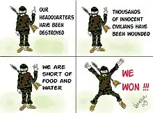 Les quatre cases comprennent ces phrases : « Nos quartiers-généraux ont été détruits », « Des milliers de civils innocents ont été blessés. », « Nous manquons d'eau et de nourriture. » mais « NOUS AVONS GAGNÉ ! »