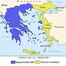 L'une des principales motivations de la guerre gréco-turque de 1919-1922 est la volonté des dirigeants grecs de mettre en œuvre la Megali Idea (Grande Idée), un concept central du nationalisme grec. La Megali Idea est une volonté irrédentiste de donner naissance à une sorte de nouvel Empire byzantin qui dominerait les deux rives de la mer Égée, autrement dit une « Grande Grèce » qui inclurait les territoires peuplés de Grecs mais encore situés à l'extérieur des frontières nationales (en Ionie, en Thrace, sur le Pont, à Constantinople, etc.). De la Guerre d'indépendance grecque en 1821-1830 jusqu'à la Dictature des colonels dans les années 1970, la Megali Idea joue un rôle fondamental dans la politique hellénique. De nombreux hommes politiques grecs ont ainsi fait référence, dans leurs discours, au caractère « historiquement inévitable de l'expansion du royaume de Grèce »[13]. Le Premier ministre Ioannis Kolettis déclare ainsi, devant l'Assemblée nationale grecque, en 1844 : « Il y a deux grands centres de l'Hellénisme. Athènes est la capitale du royaume. Constantinople est la grande capitale, la Ville, le rêve et l'espoir de tous les Grecs »[13].