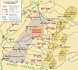 - Préalable (décembre 1918) : à la suite de l'union de la Transylvanie à la Roumanie, l'armée roumaine prend position en Transylvanie et dans le Nord-Est du Banat.