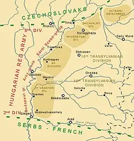 - Première phase (avril 1919) : l'Armée rouge hongroise tente de récupérer ces régions mais les Roumains contre-attaquent et atteignent la rivière Tisza.