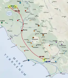 Jusqu'au développement de Latina dans les temps modernes, le sud-est du Latium est recouvert par les marais Pontins. Entre ces marais et les monts Lepini, il y a une zone de terres sèches, l’ager Pomptinus[16]. La région pontine est le théâtre de la plupart des combats opposant les Romains et les Volsques pendant les décennies 380 et 370.