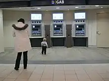 Un guichet automatique bancaire (GAB) en France et au Canada, aussi guichet automatique (GA), bancomat en Suisse et en Vallée d'Aoste[1], Bancontact (ou MisterCash) en Belgique, gabier à la Réunion, est un appareil électronique et électromécanique permettant d'effectuer des transactions bancaires en libre-service. Différents modèles de GAB permettent de faire des retraits, acceptent des dépôts en espèces ou par chèque, ordonnent des transferts de fonds, impriment des mises à jour de carnets de chèques, augmentent le montant d'une carte d'appel téléphonique voire vendent des timbres-poste. En Suisse, en Espagne, au Portugal (réseau Multibanco) et au Canada, il est aussi possible de régler certaines factures via un GAB.